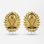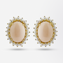 Une bague et des boucles d'oreilles en or jaune 18 carats serties de cabochons ovales de corail rose, entourés de perles de culture Akoya naturelles. Le halo de perles fines met en valeur les cabochons de corail et crée un ensemble à la fois doux et chic.