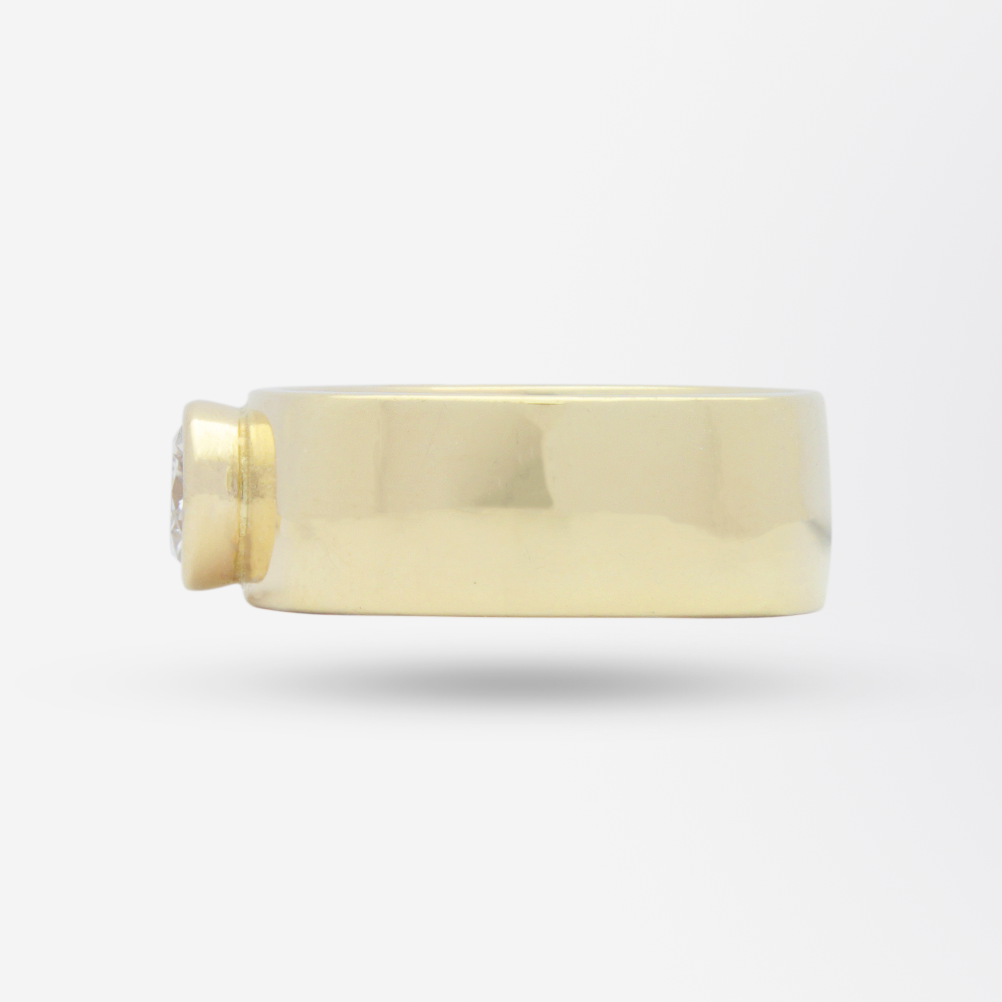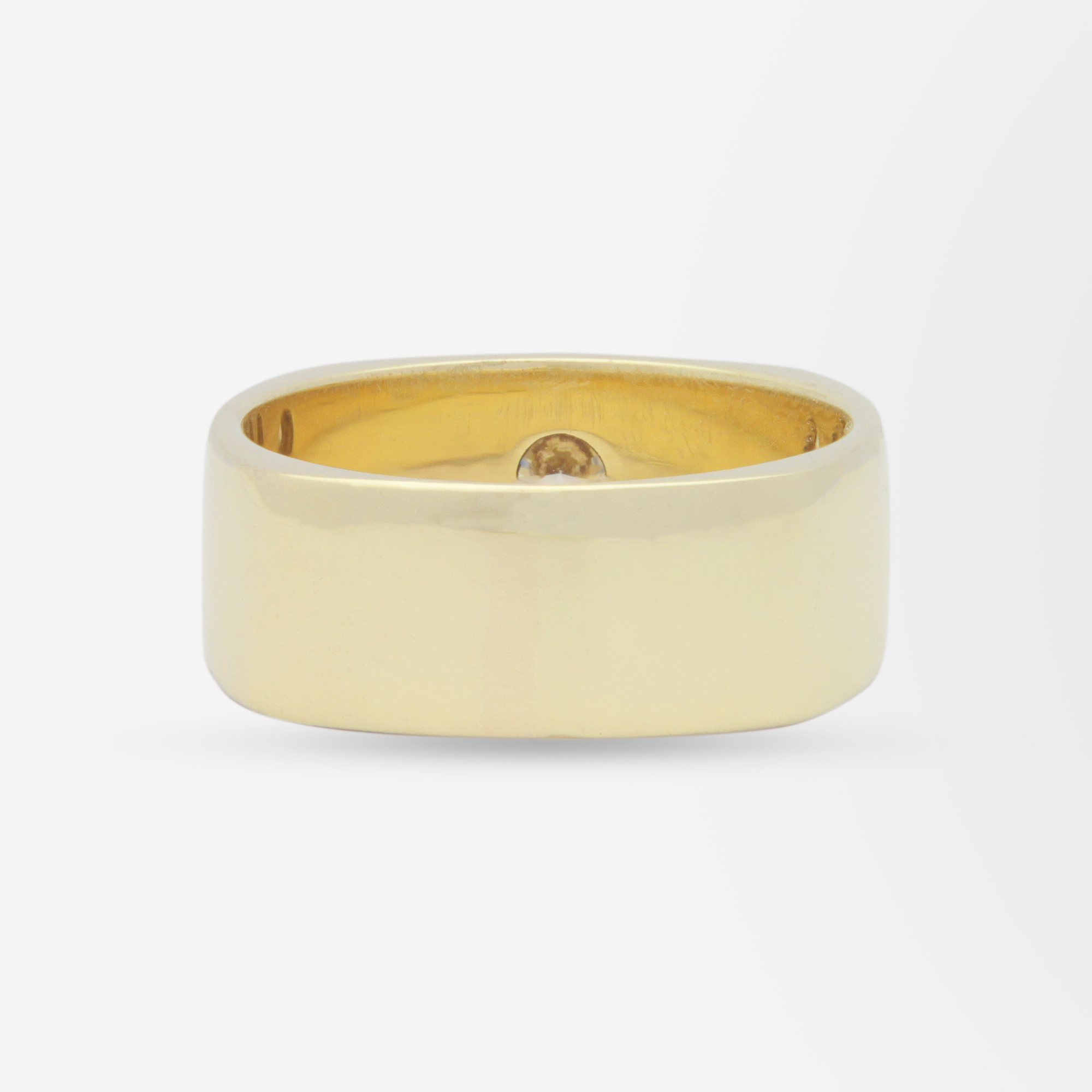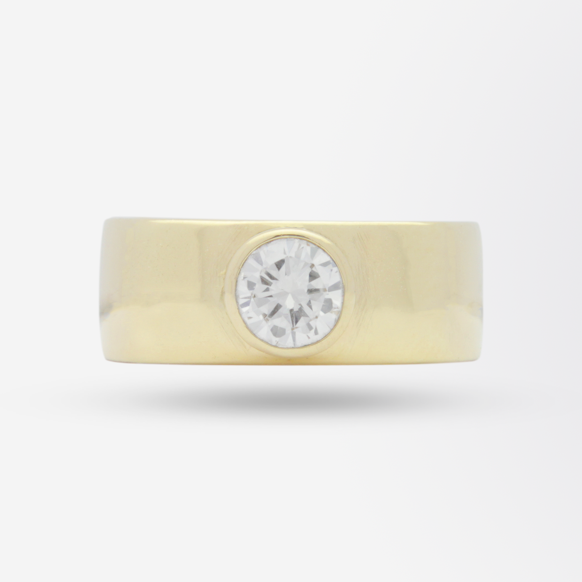 This very simple ring is crafted from 14 karat yellow gold and has been set with a single brilliant cut diamond. The shank of this ring is a slightly rounded square which gives it a very modernist look and feel. To the centre top is a single 0.50 carat round brilliant cut diamond which is of G/H colour and VS clarity that has been rub-over set. The very simple ring has been stamped '14K' for the purity of the gold, however its maker is unknown. This particular ring could be a good engagement ring for someone who wants little fuss and a clean look without scrimping on quality.