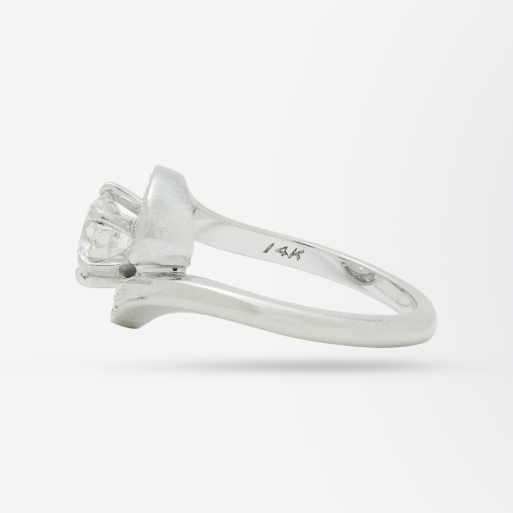 A fine and elegant white gold ring set with diamonds in a swirl design. The central stone is a brilliant cut diamond weighing 0.73 carat, of H/I colour and P1 clarity. The shoulders of this piece are each set with five single cut diamonds which swirl from each side of the shank to encompass the central stone. The body of the ring has been crafted from 14 karat white gold which over time has developed a beautiful matte finish. An excellent diamond dress ring, or the perfect engagement ring!