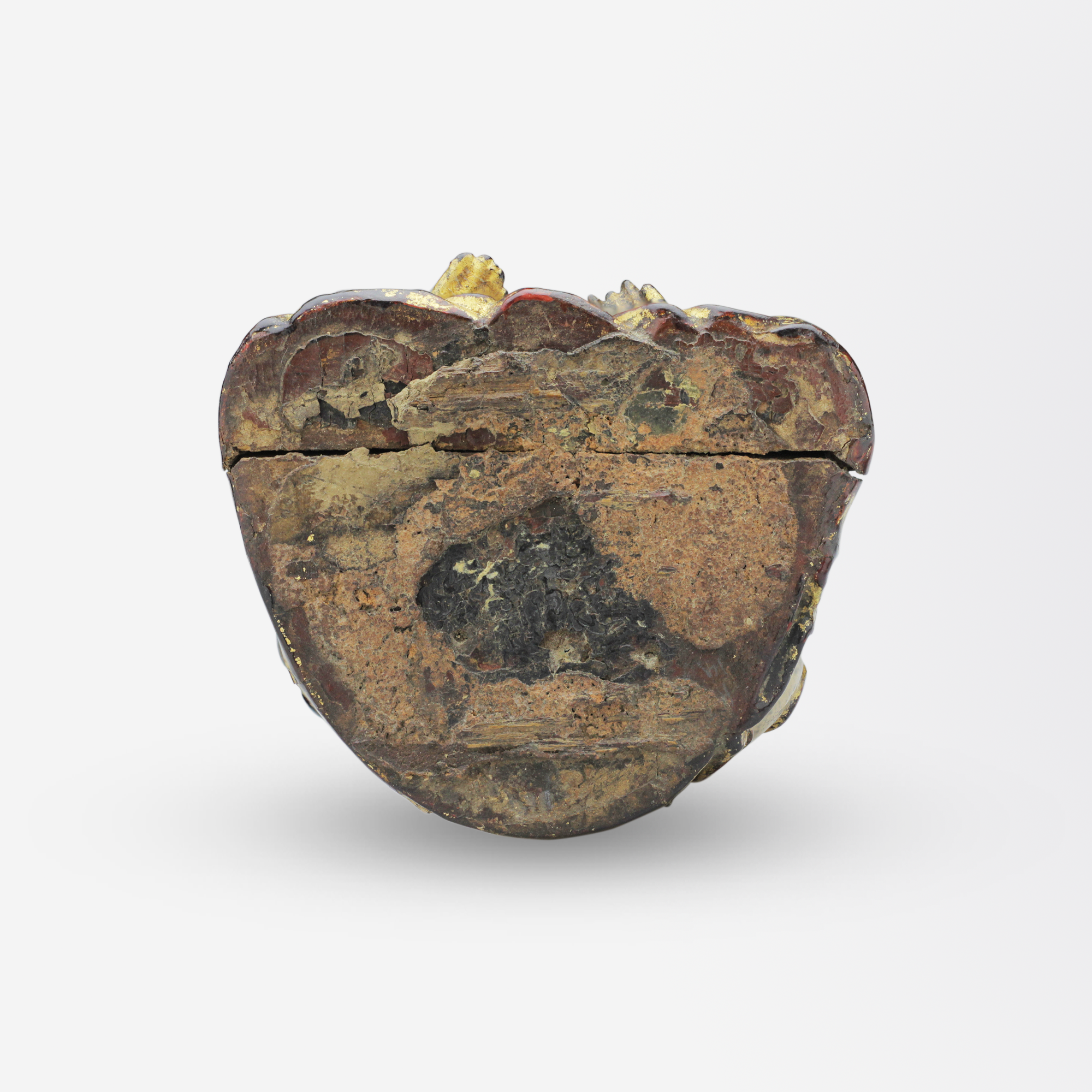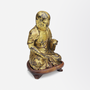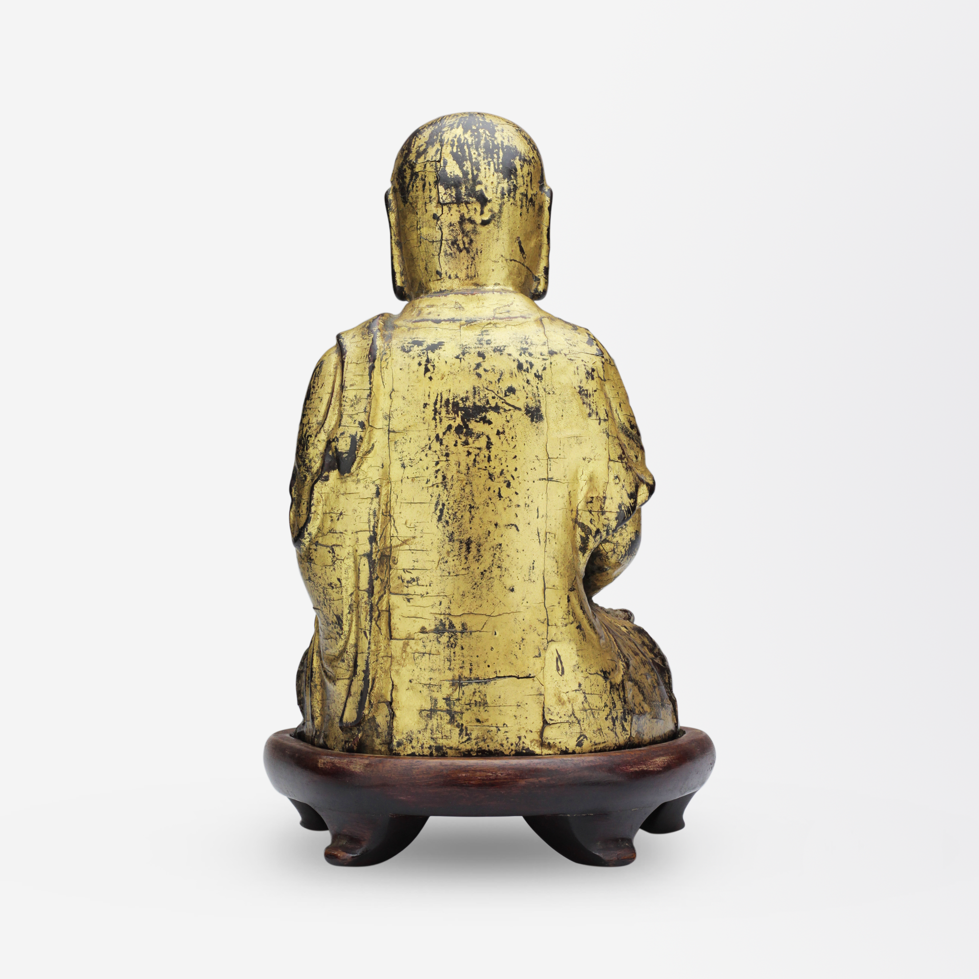 This early carved timber Luohan was possibly part of a larger devotional shrine and is presented with a later base formed to fit him neatly seated in meditation. He wears the simple robes of a monk and gently downcast expression and hands open to the sky.