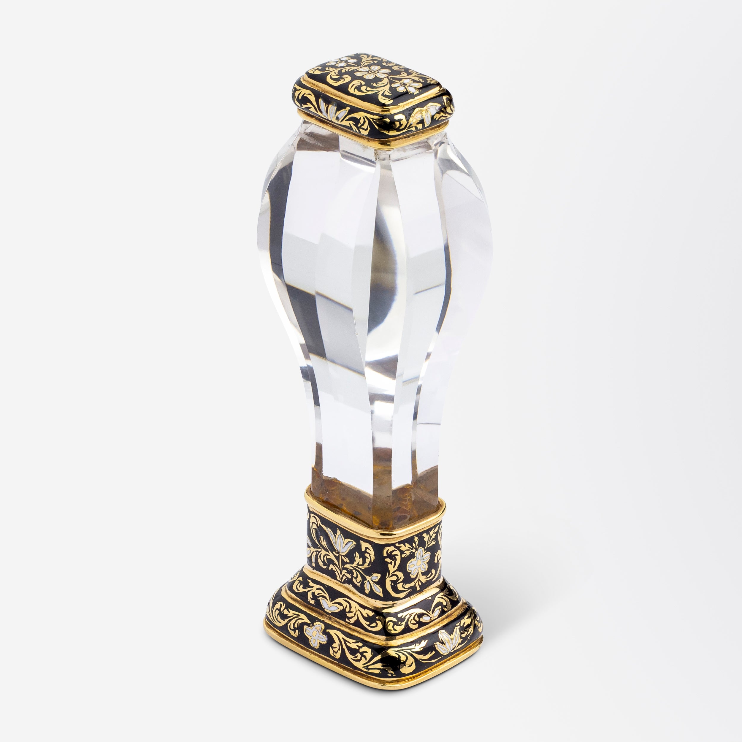 This antique desk seal dates to the 19th Century and likely originated in France. The handle of the seal is a piece of polished and faceted rock crystal which is extremely clear to the eye and can be looked through as though it is a window. To the top of the handle is a section of finely enamelled 18 karat gold which has ornate vines and flowers over its surface. The base of the piece is again finely enamelled 18 karat gold that encases a smooth piece of carnelian known as the 'matrix', which is to date blank. The beauty of this antique seal is that it can be engraved with your own family crest or initials because it has remained blank throughout its history. A beautiful desk accessory in lovely condition with only some minor wear to the enamel and very minor flea bites to the rock crystal.