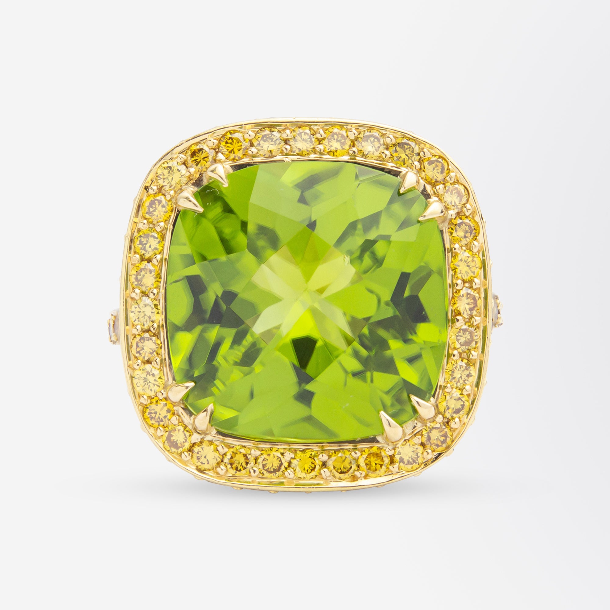 This 18 karat yellow gold ring is likely a copy of a 'Nardi' design originating in Italy. The cast 18 karat yellow gold ring centres on a 12 carat 'square cushion checkerboard cut' green peridot which is classed as 'bright mid yellowish green very lightly included'. The central stone is surrounded by a halo of 64 brilliant cut yellow diamonds. The shank and shoulders of the ring are set with a further 31 round brilliant cut yellow diamonds. These diamonds are each of 'fancy intense brownish yellow' colour and SI clarity totalling 1.0 carat. This ring was acquired with another very similar ring which was hallmarked for the Italian jewellery maker 'Nardi', however this peridot piece appears to be a copy of this Nardi ring, not an original. Regardless the piece is made to the same standard as its counterpart and the stones are of excellent quality. We have included an image of its pink tourmaline counterpart for reference, however please note the pieces are sold separately. A beautiful summery cocktail ring which sparkles beautifully in the light.