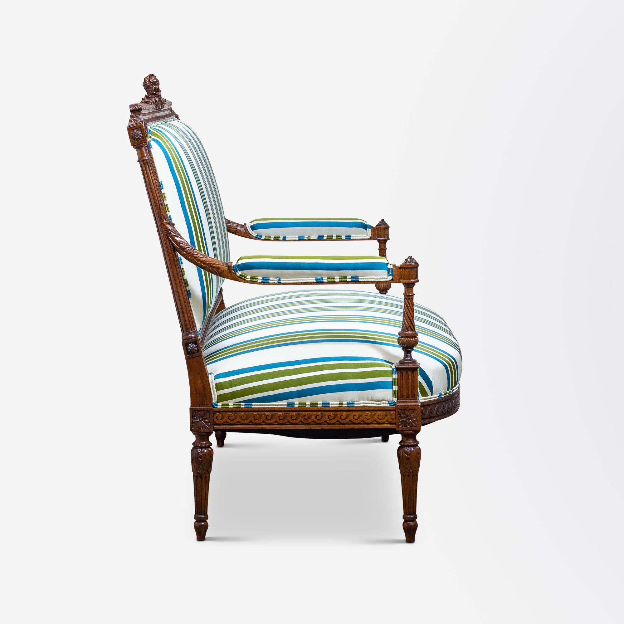 This recently reupholstered French settee dates to the 18th Century during the reign of Louis XVI. The carved walnut piece sits on four graceful, tapered and grooved legs which attach to its upholstered arm-wrests which are accented with acanthus leaves. The backrest of the piece features a central wreath of flowers and ribbon motifs to each side.