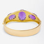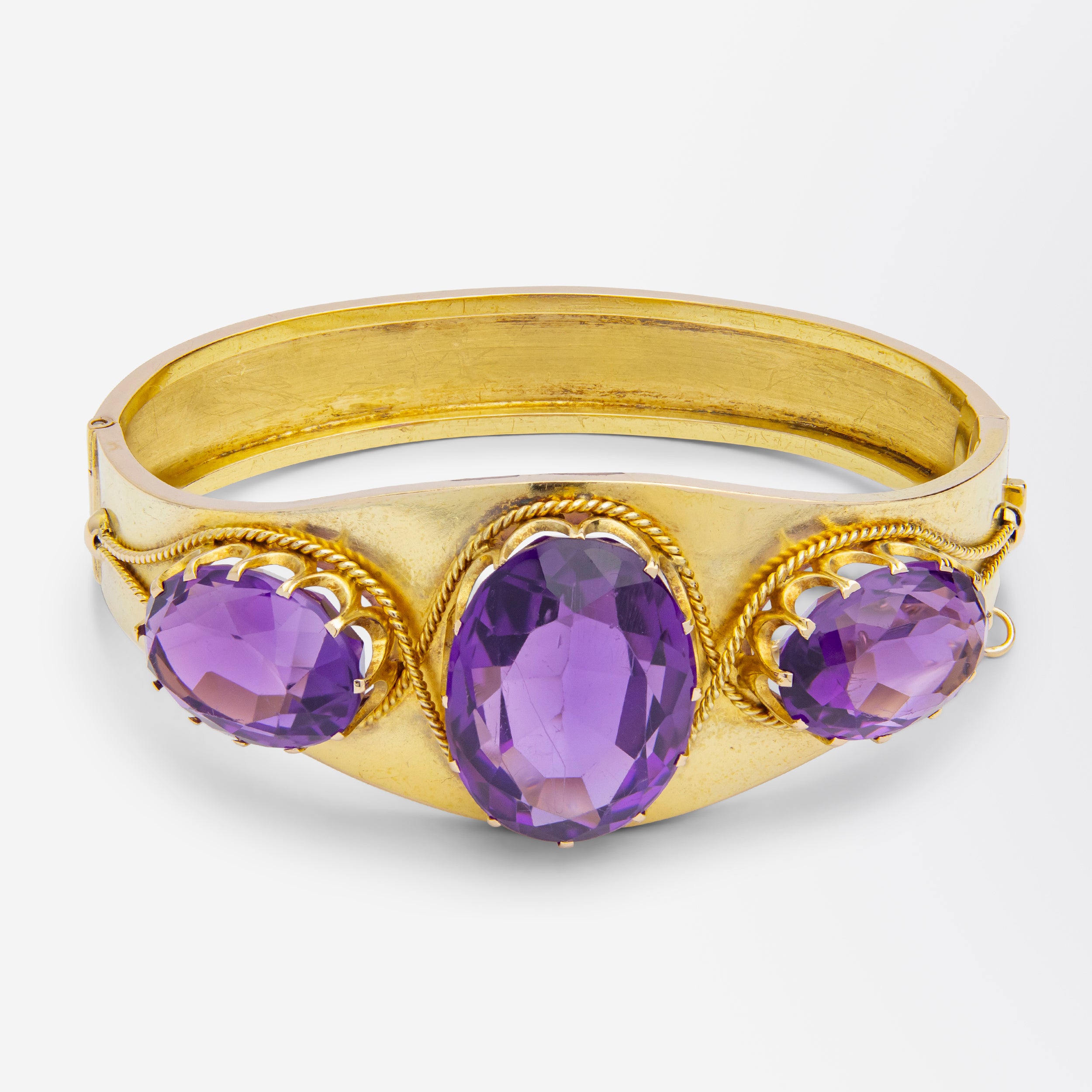 One of our favourite jewellery styles is Etruscan Revival, and this bangle is a lovely example of English jewellery from the last quarter of the 19th century. Crafted from 15 karat yellow gold the hinged oval bangle has been set to one side with three oval cut amethysts weighing approximately 53 carats in total. The amethysts are a typical stone used in English jewellery during the 1870s and 1880s, the era this bangle dates to, and paired with gold it creates a striking piece of jewellery. Surrounding the amethysts is some very fine twisted wirework which is a common feature in jewellery made in the Etruscan Revival taste. The bracelet terminates with a secure tongue and box clasp and features a fine gold safety chain for extra security. The piece is in very good antique condition, with minor wear to the surface of the gold and some abrasions to the facets of the amethyst, commensurate with age and use. An absolutely gorgeous example of Victorian period Etruscan Revival jewellery.