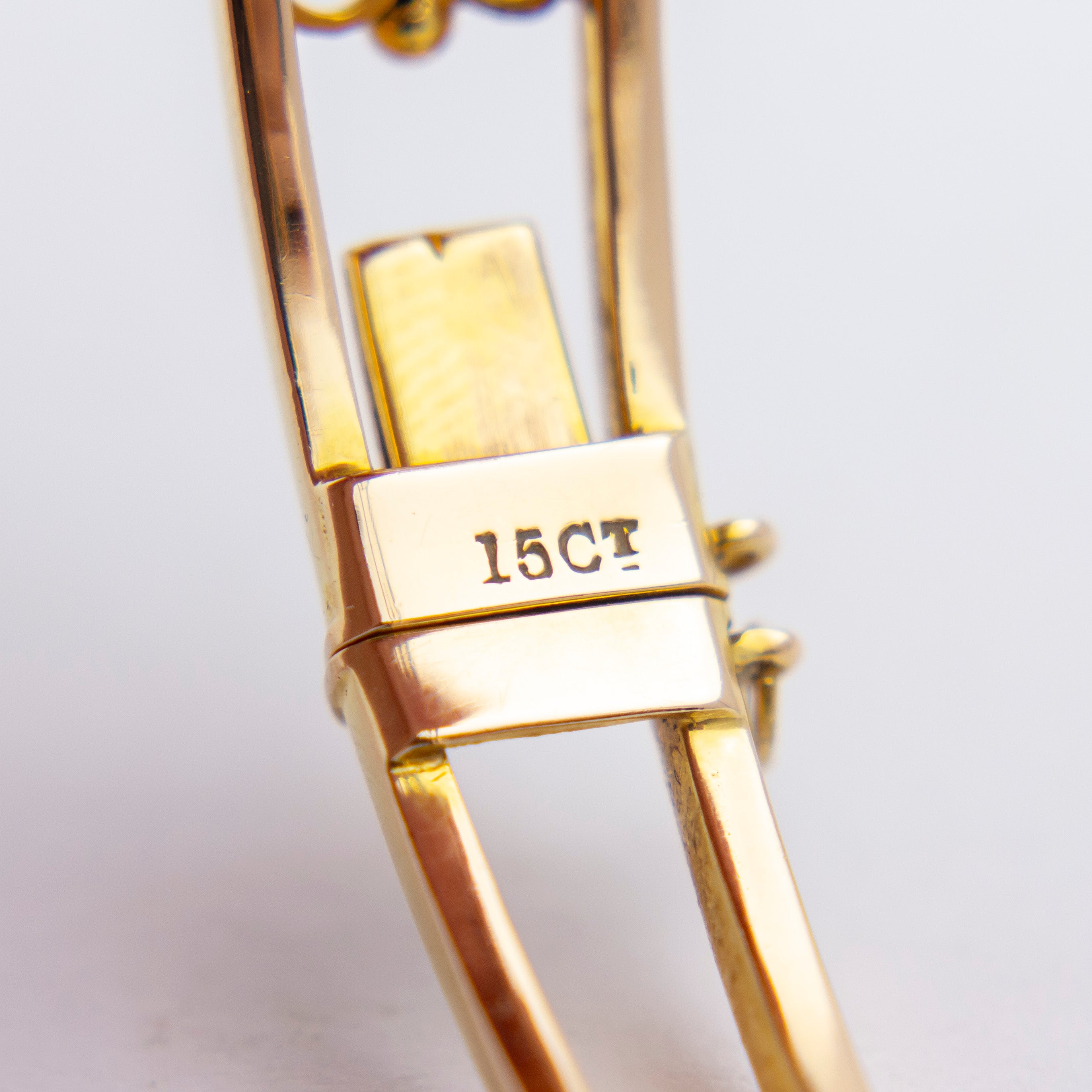 This really charming antique bangle dates to the Victorian period and was most likely made in the United Kingdom. Crafted from 15 karat yellow gold the centre front of the oval bangle is set with 17 graduated white seed pearls which are flanked by ornate scrollwork. The bangle is hinged and terminates with a tongue and box clasp which is working well and secure. There is provision for a safety chain to be attached should you desire, however the original is no longer present and has been lost with time. Because of the gold purity of the bangle we can fairly safely say that it originated in England, likely during the 1870s, the height of the Victorian period. A gorgeous antique bangle in and in lovely condition for a piece which is 150 years of age.