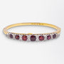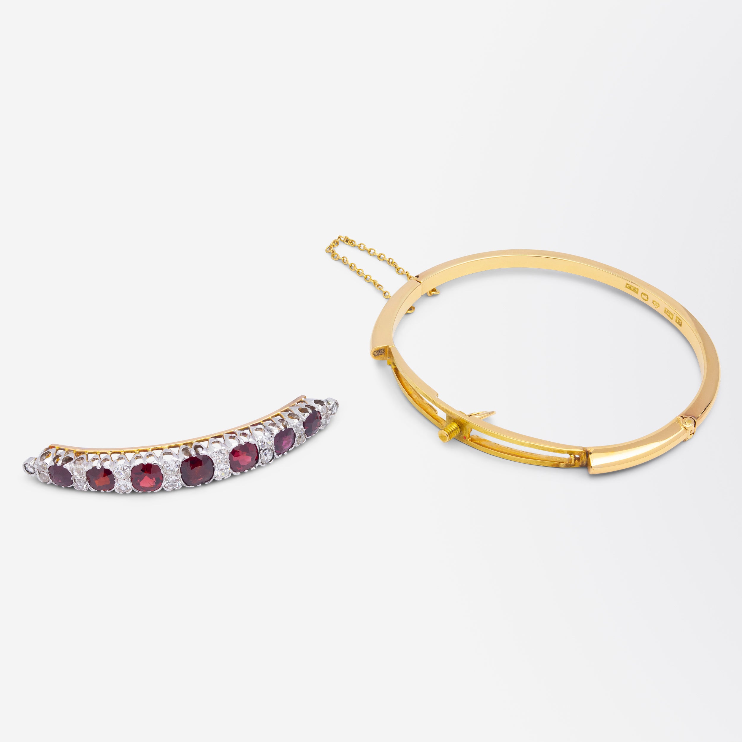 Crafted from 18 karat gold and platinum, this convertible bangle has been set with deep red garnets and diamonds. The bangle has been crafted in Sweden in the early part of the 20th century by CG Hallberg, a notable maker and jeweller to the Swedish court. The oval hinged bangle has been crafted from 18 karat yellow gold and then set to one side with a panel of garnets and diamonds. The seven deep red garnets are all cushion cut and are accented by 18 old mine cut and rose cut diamonds. Each of these diamonds are estimated to be between G and I colour and SI to P1 in clarity totalling approximately 1.38 carat. This panel of garnets and rubies have been set in a platinum mount which is detachable from the bangle with a screw mechanism to the rear. The purpose of this detaching is likely to allow the garnet and ruby panel to be connected to a hair pin/clip, which has unfortunately been lost to time. The hinged bangle has a tongue and box clasp with an attached safety chain and is working well and is secure. The inside of the bangle is stamped with crisp Swedish hallmarks allowing us to date the manufacture of the piece to circa 1911. In remarkably good order the bangle is a really gorgeous piece of antique armwear by an esteemed maker.