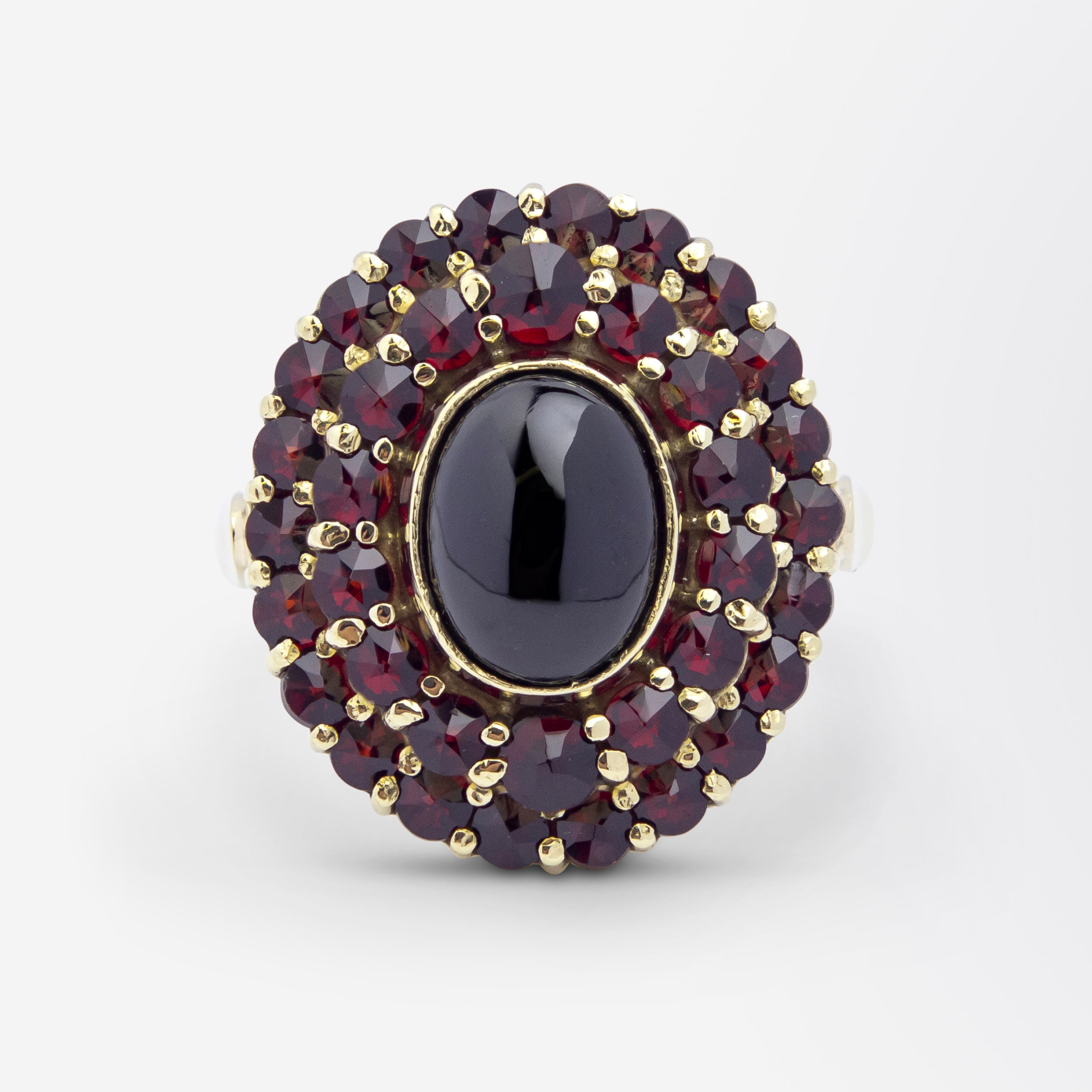 Crafted from 14 karat yellow gold and set with Bohemian garnets, this ring is a delightful example of jewellery from the Czech Republic. The ring centres on an oval cabochon garnet which is surrounded by a double halo of faceted garnets which have all been set in 14 karat gold. In the side profile image you can see that the halos are stepped, giving the ring height on the finger when worn. Known for deposits of rich red garnets, Bohemia, or the modern day Czech Republic is famous for their garnet set jewellery. Whilst this ring is perhaps only 30 or 40 years old, it is a beautiful example of Czech craftsmanship and set with well matched rich red garnets.