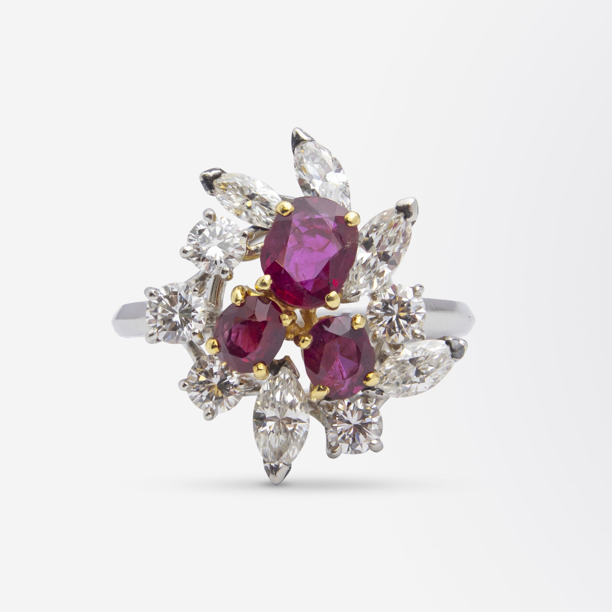 This hand crafted platinum, diamond and ruby ring was manufactured by one of the most esteemed French jewellers, Chaumet. The handmade platinum mount has been mounted with three natural rubies, each an oval cut, totalling 1.42 carat with each of them being set with 18 karat yellow gold claws. The balance of the ring has been set with five round brilliant cut diamonds and five marquise cut diamonds, each of G/H colour and of VS-SI clarity totalling 1.85 carat. Each of these diamonds have been set with platinum claws, and they surround the central ruby cluster in an asymmetric halo of sorts. The ring is signed 'CHAUMET RM' and there is a small rubbed French mark making it hard to date, however we believe it has been manufactured during the 1960s or 1970s as it has the look of a cocktail ring of that era. Chaumet was established in France in 1780 and were known to create pieces for Napoleon and Josephine, and have long been credited for crafting some of the world's most historic diamond tiaras. This really elegant cocktail ring would be a beautiful gift for a lady celebrating her ruby wedding anniversary, or a delightful push present for a mother to be.