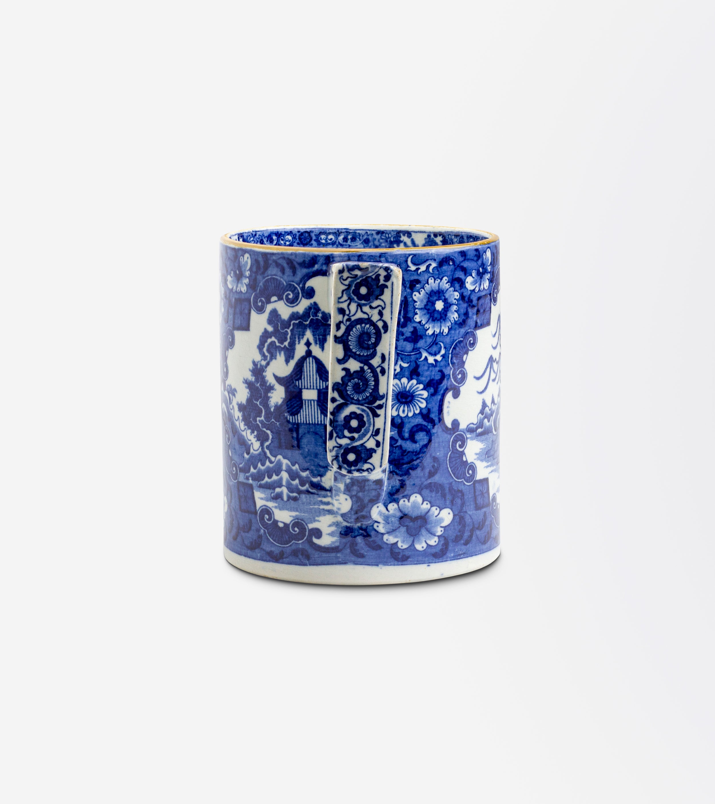 This charming and rather large tankard was made in England in the early 19th century. The straight sided tankard has been richly decorated with an array of blossoms and panels featuring pagodas reminiscent of the Blue Willow pattern. The oversized tankard has been decorated with a transfer print evidenced in the area around the handle where some of the pattern overlaps. The tankard presents in good antique condition with the usual crazing and minor glaze chipping, however has no cracks and no chips to the body. A really gorgeous piece of antique blue and white porcelain which would be right at home amongst a blue and white grouping on a kitchen dresser.