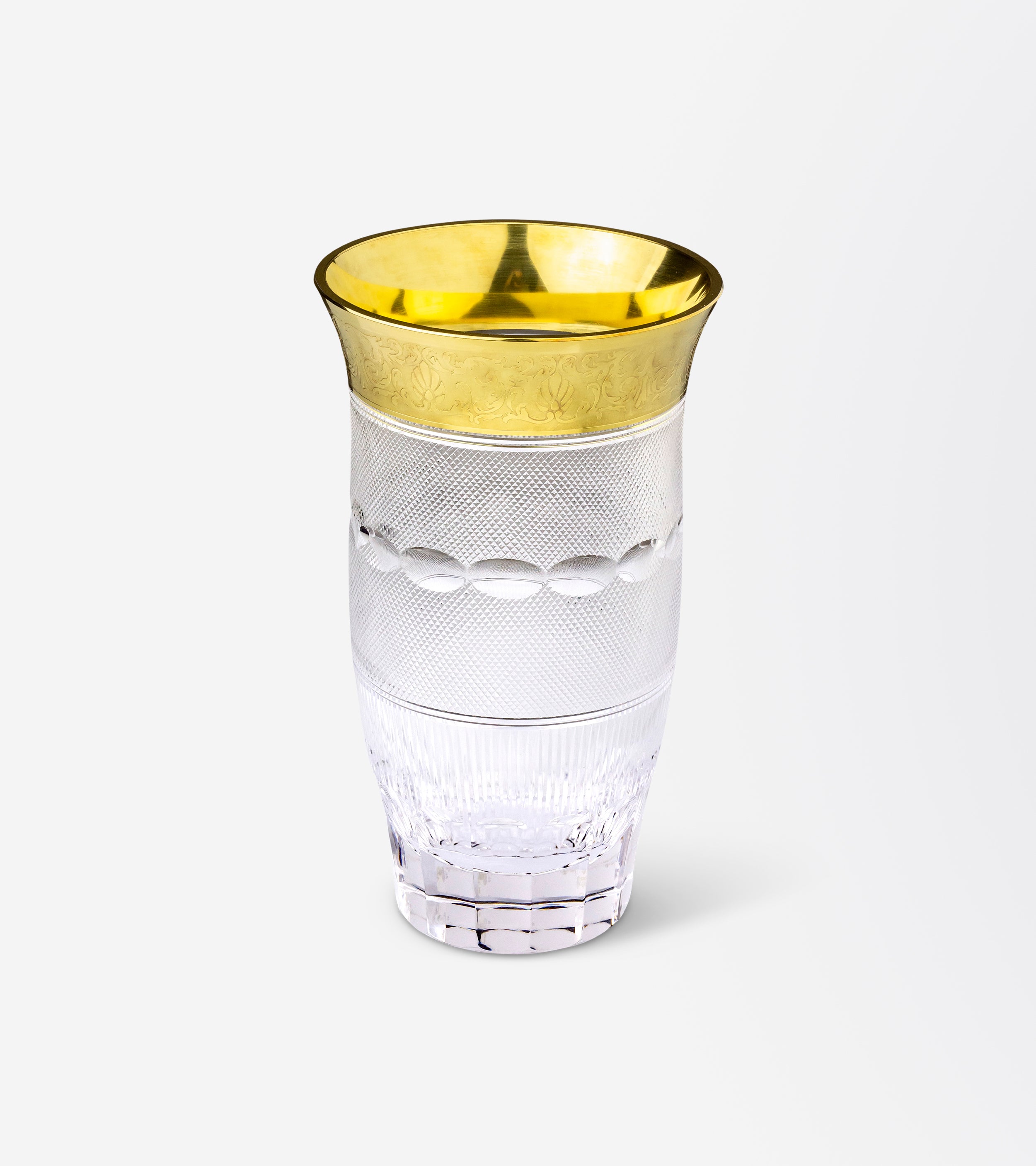 This very practical vase was made in the Czech Republic by famed glassmaker, Moser. The vase which is made from lead free crystal is in the 'Splendid' pattern which was first introduced by Leo Moser in 1911. The pattern features an ornate 24 karat gilt rim which sits atop of a very intricate cut crystal body and has been made in a variety of shapes and sizes throughout its history. The Splendid pattern has been a staple among some of the world's finest dining rooms for decades with the Czechoslovak president gifting the late Queen Elizabeth II a selection of Splendid crystal for her wedding in 1947. This particular vase retains its original retailing label and has an acid etched signature to the underside which have helped us date its manufacture to post 1992, when Czechoslovakia became the Czech Republic. In immaculate condition, the vase has very few signs of wear, with no chips or cracks to the crystal, and even minimal wear to the underside. A gorgeous piece of Moser crystal which would hold a dozen roses very beautifully.